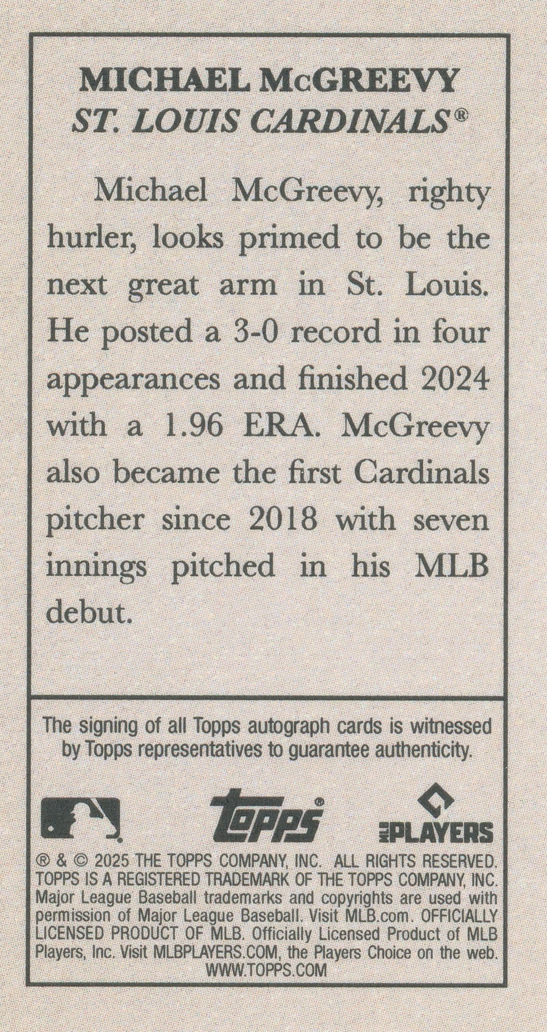 MICHAEL McGREAVY RC 2025 Topps T205 ON CARD AUTO ~ Cardinals