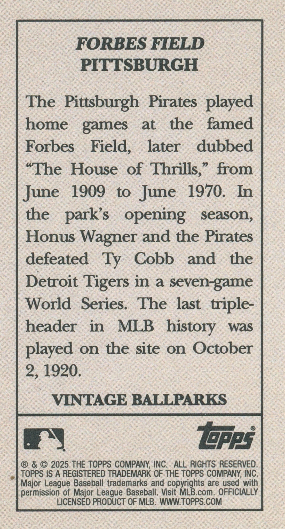 FORBES FIELD 2025 Topps T205 Vintage Ballparks SSP ~ Pittsburgh